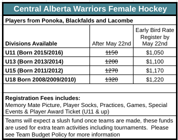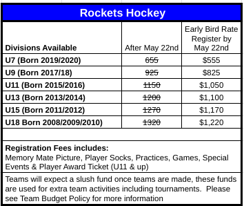 Parents/Guardian must attend the AGM and register players by May 22nd to maintain the early bird discount of $100 off registration for Rockets U7-U18 and CAW U11-U18. Annual General Meeting is May 22nd, 7pm at the LMC